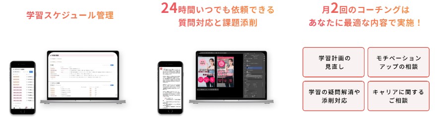 全てを学ぶ必要はなく、自分のゴールに合ったスキルを専属コーチと相談しながら選べます。「Webデザインだけでなく、SNS運用も学びたい」という場合も、一つのスクールで完結できます。